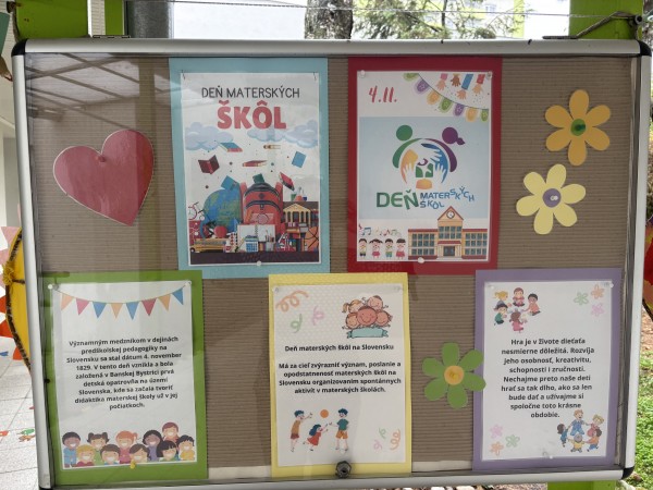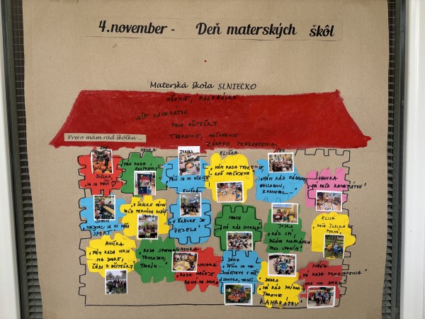 4.november 2025 - slávia svoj Deň všetky materské školy, aj v našej Materskej škole Slniečko sme si ho pripomenuli. Deti sa vo všetkých triedach rozprávali a hodnotili život v našej Materskej škole Slniečko, zaspievali si hymnu materských škôl. Dozvedeli sa, prečo je pre nás tak významný tento deň. Na základe zážitkov a dojmov z rozhovorov vytvorili nápadité práce, ktoré si môžete pozrieť v átriu našej MŠ Slniečko.