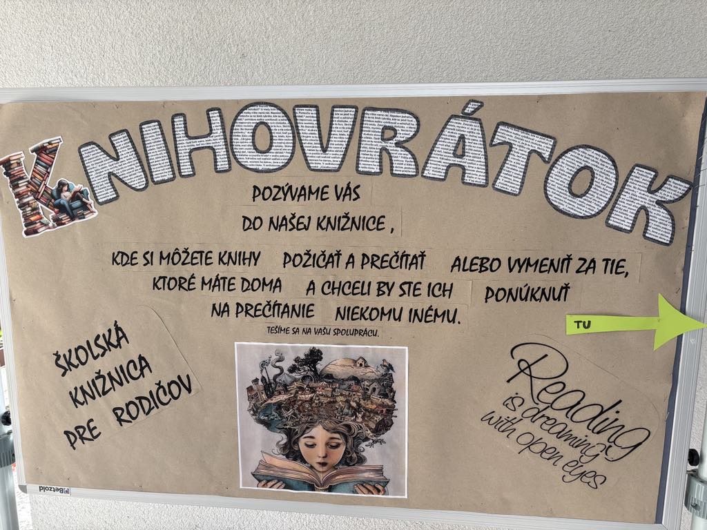 Milí rodičia, pozývame Vás do novootvorenej knižnice pre Vás rodičov "KNIHOVRÁTOK", kde si môžete knihy požičať, ale aj vymeniť alebo doniesť nejaké z domu. Budeme sa tešiť, keď nám prispejete zaujímavými knihami rôzneho žánru. Knižnica sa nachádza na prízemí v pavilóne "C".